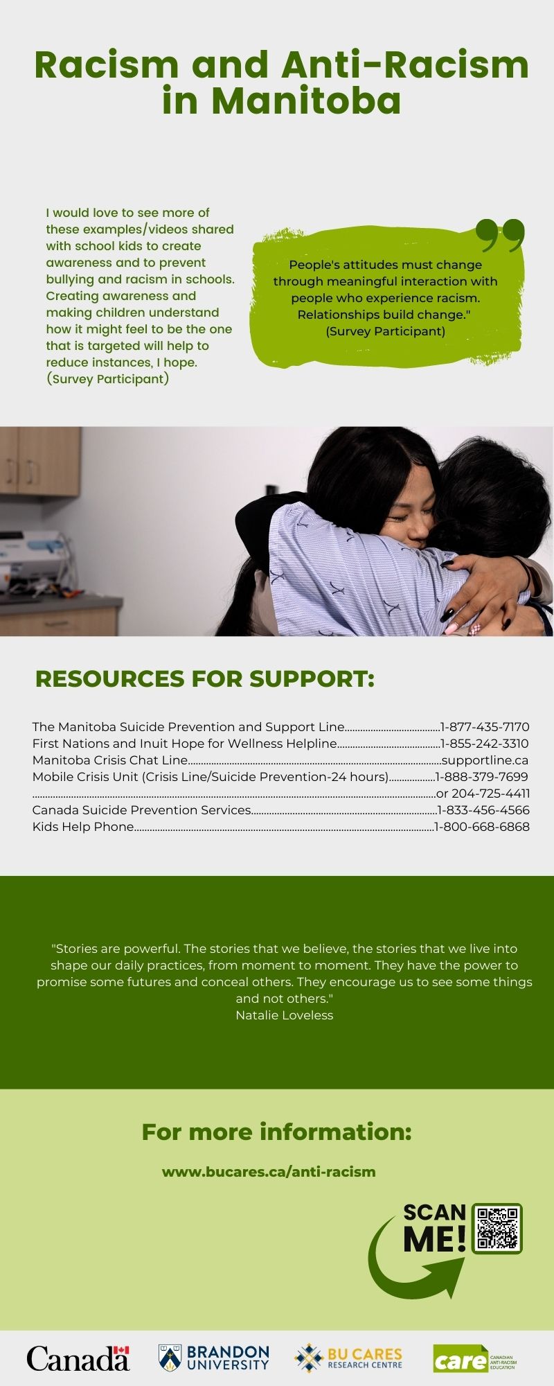 These videos were created as part of a 2-year research project, funded through Canadian Heritage’s call for Anti-Racist Action Plans. Our research team at Brandon University wondered if, since vitriol seems to go viral so easily, might we be able to produce research-based, educational videos that can occupy the same online spaces? We conducted a survey of 500 Manitobans, asking them to share their experiences with racism. Based on those responses, we wrote scripts, tested them in focus groups, and then hired filmmakers to make each film.