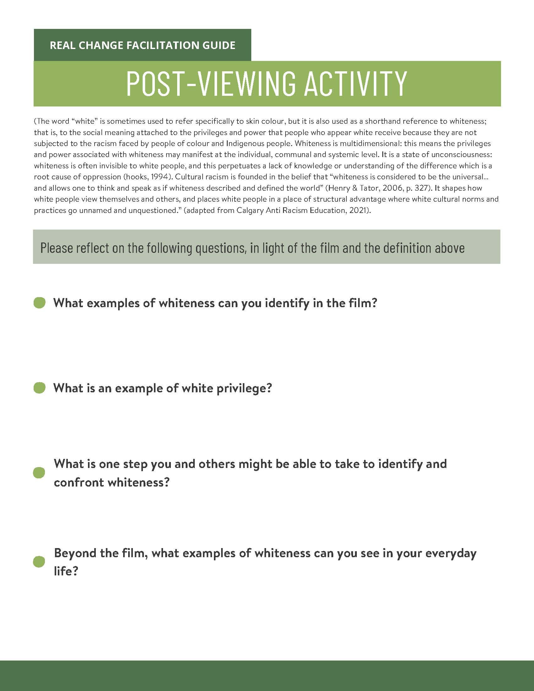 We have a more fulsome definition in the #RealChange Facilitator’s Guide. However, our working definition of racism is that of an umbrella term that encompasses all acts of othering, bias, discrimination, microaggressions, and subtle acts of exclusion.